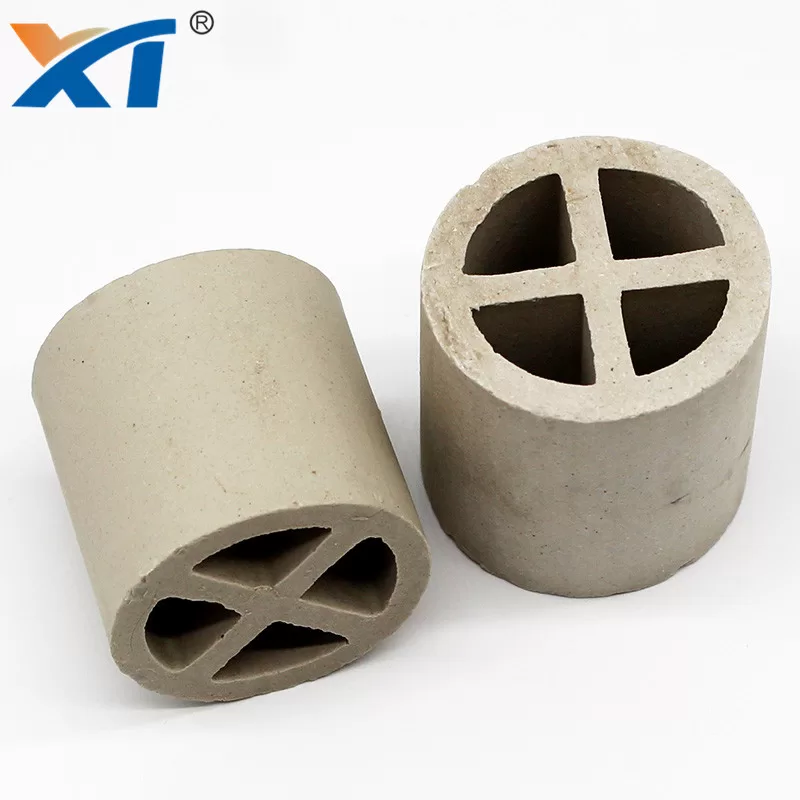XINTAO Ceramic Cross Partition Ring is based on increased surface area of filter to enhance the efficiency of mass transfer on the idea and developed a new ceramic packing, the structure is added in the raschig rings in the cross partition. I n general, this packing the large size, only applied to neat pile, the current cross ring is generally used as lumber distribution layer with the bottom support. 80-150mm size of the ceramic can be used for supporting cross ring material, porosity greater than 60%.